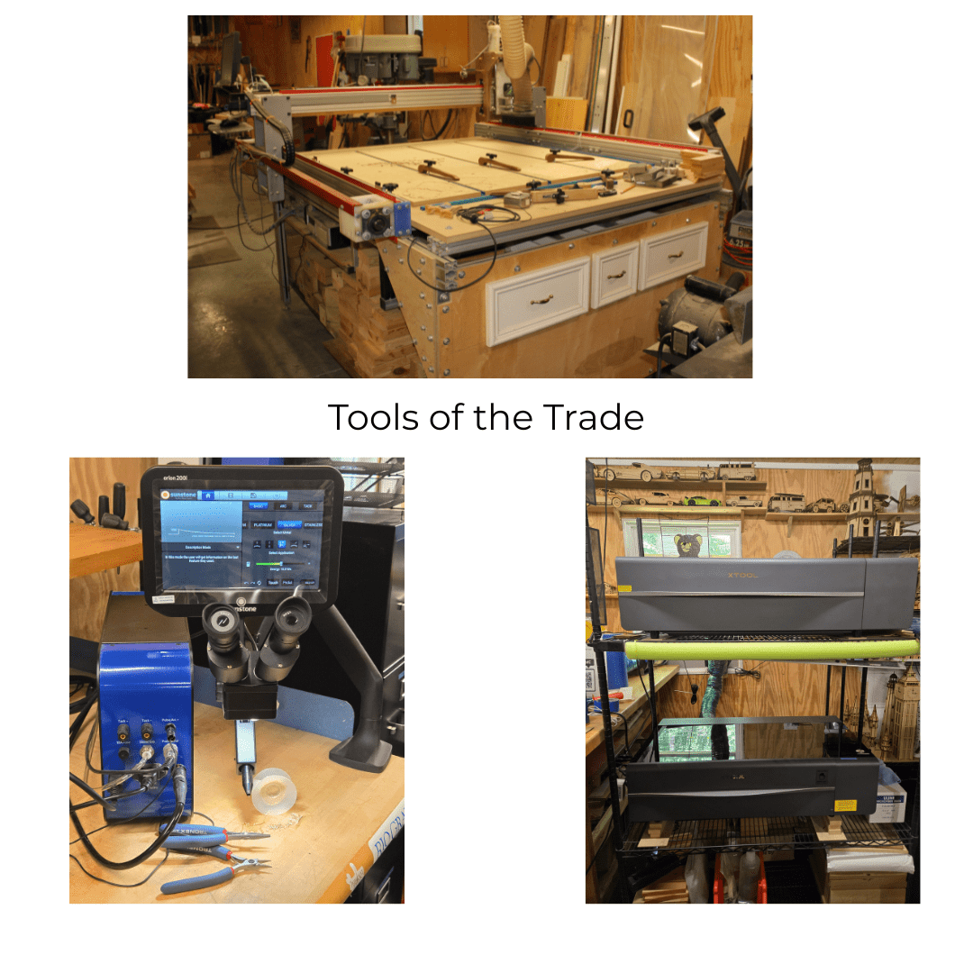 Ken is the tech-minded maker who brings a different kind of magic. With a love of problem-solving and precision, he uses laser cutting, CNC machining, and 3D printing to create unique pieces—from intricate 3D puzzles to wooden name trains and home goods. He’s always exploring what’s possible, one project at a time.