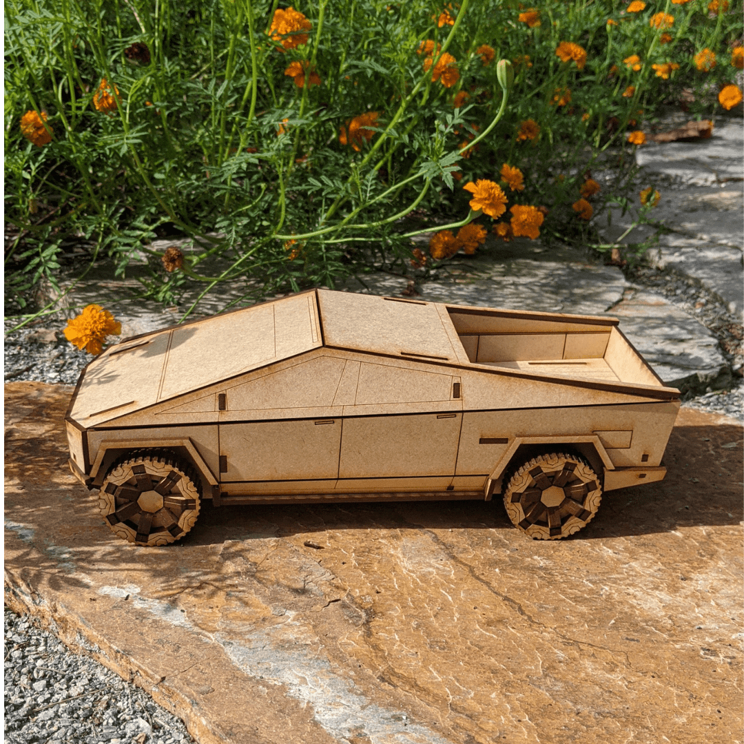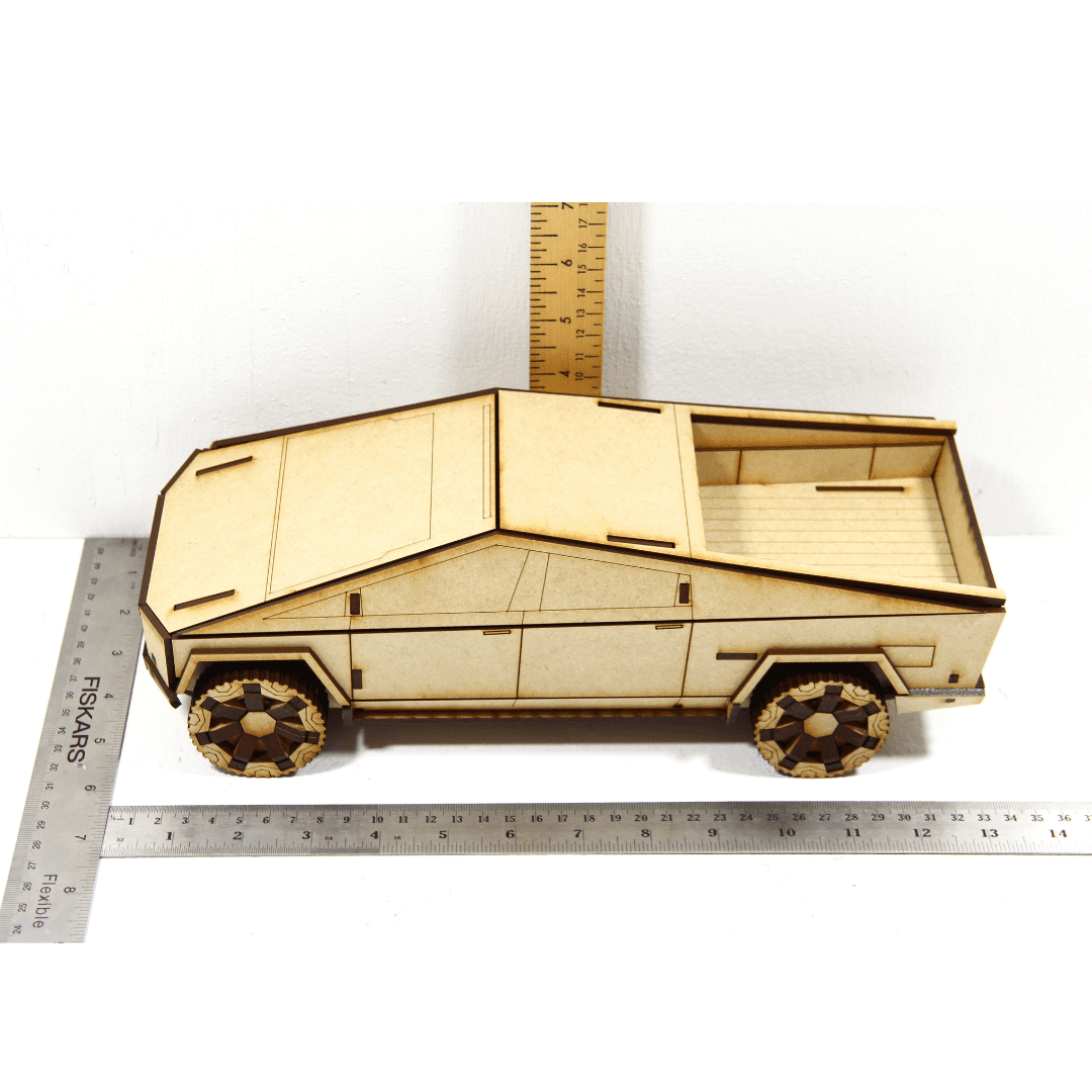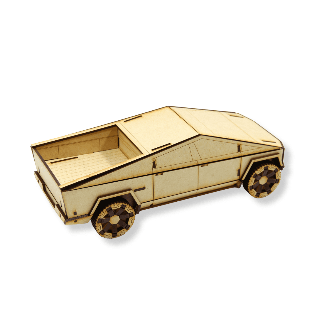 A modern, futuristic 3D wooden cyber truck puzzle designed with clean geometry and crisp laser-cut detail.