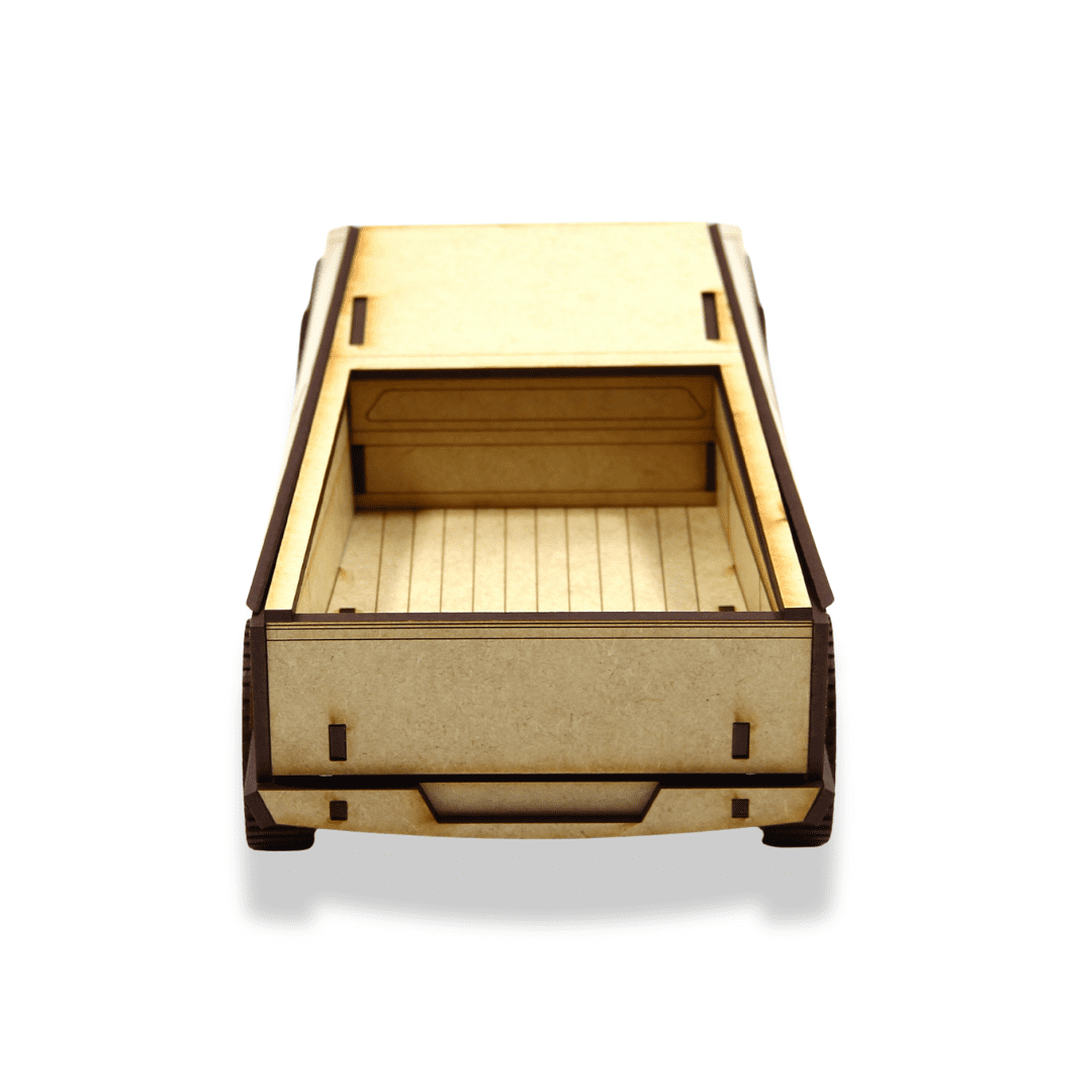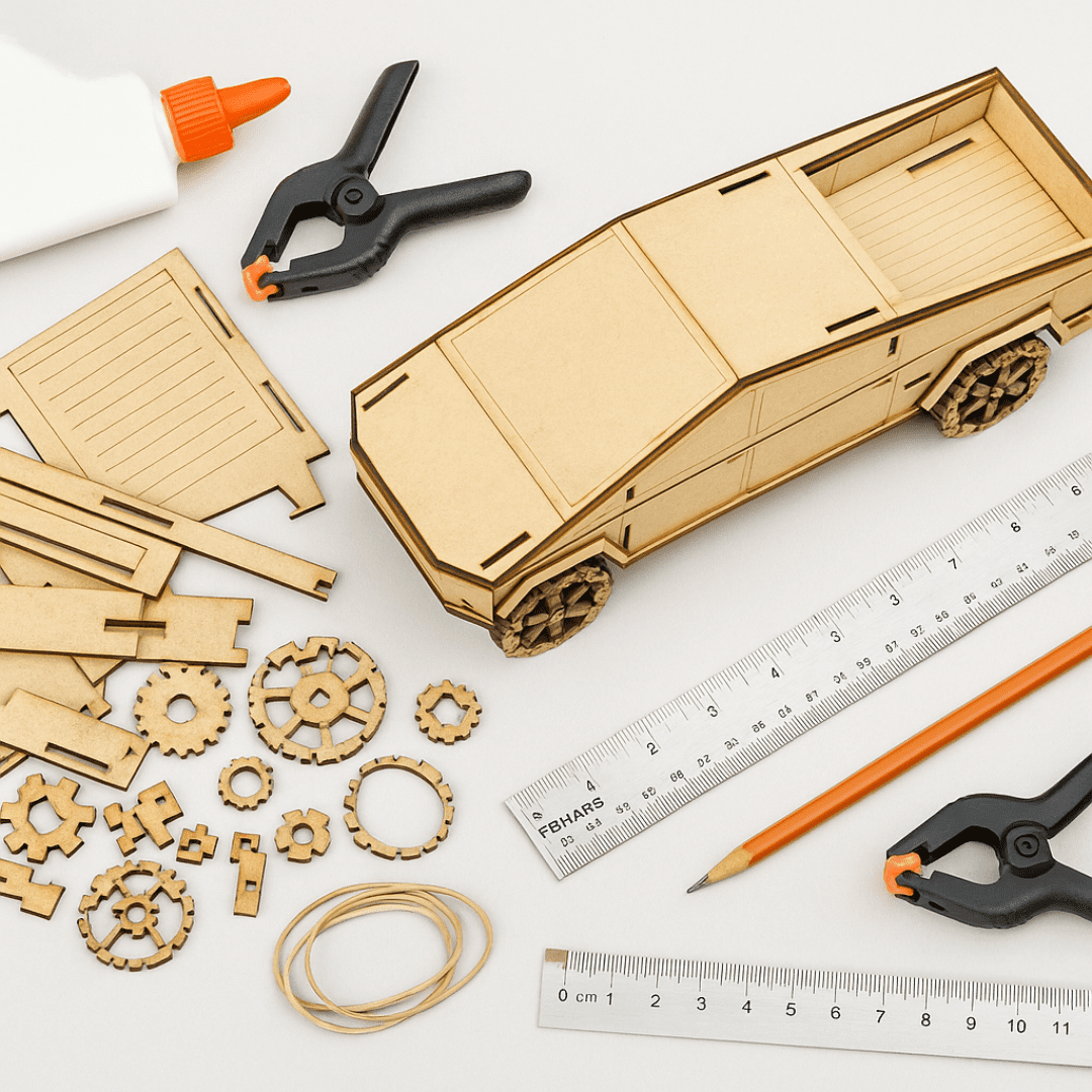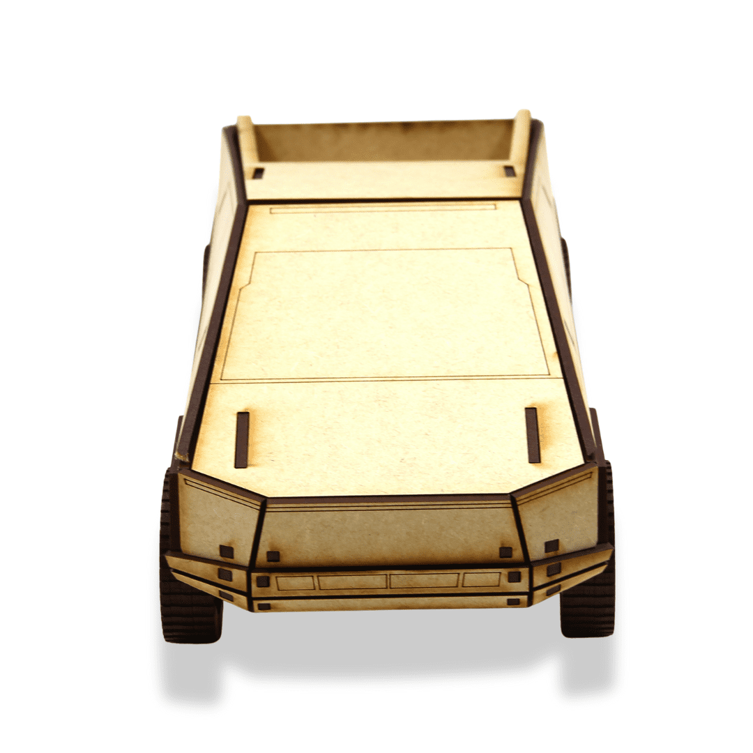 A modern, futuristic 3D wooden cyber truck puzzle designed with clean geometry and crisp laser-cut detail.